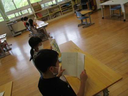 国語「雨のうた」では、雨の歌とはどのようなものか想像を膨らませながら自分の考えを話し合いました。音読を繰り返し行う中で、工夫できそうなところを見付け、抑揚や強弱をつけながら読みました。