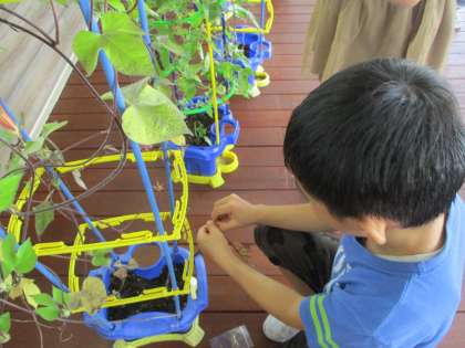 学校にもってきたあさがおの様子を見ると、夏休み前とは変わっていました。