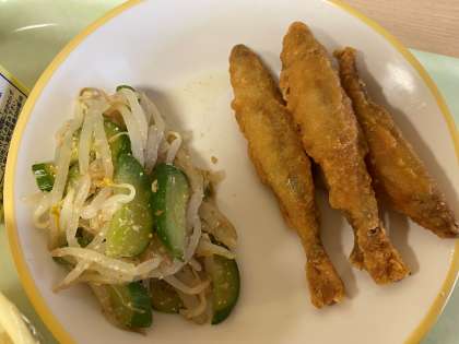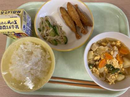 今日の献立は、ごはん、わかさぎのフリッター、甘酢和え、高野豆腐の卵とじ、牛乳です。