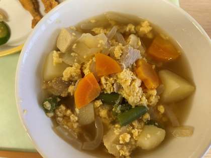 わかさぎのフリッターは、かりかりに揚げてあり、食感がよい一品です。また、高野豆腐の卵とじは、豚肉やニンジン・インゲンなど具だくさんで食べ応えがありました。