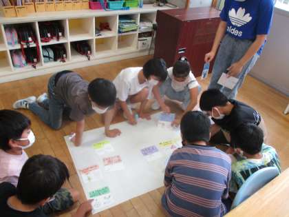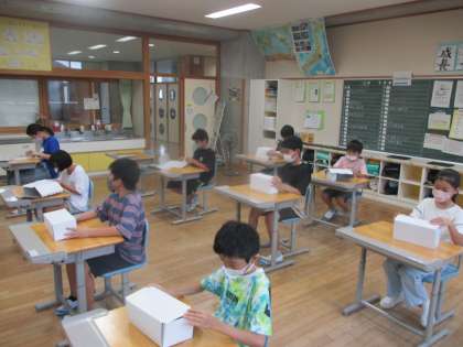 5年生の今日の様子です。夏休みの宿題であった、自分たちにできるSDGsの目標を発表し合いながら模造紙に貼ったり、図工の学習「のぞいてみると」では、箱を組み立てて穴から中をのぞいたりしました。