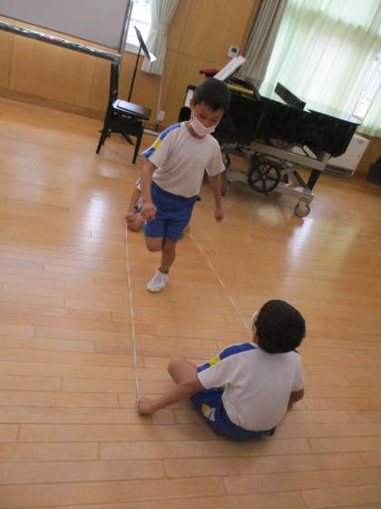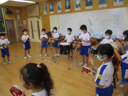 9/8 2年生 学習風景 公開日 2022/09/08 更新日 2022/09/08 2年生の部屋 「たぬきのたいこ」の学習しています。リズムに合わせて太鼓を叩いたり、ゴム跳びをしたりして体全体で音楽を感じ取っています。