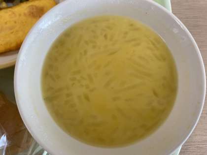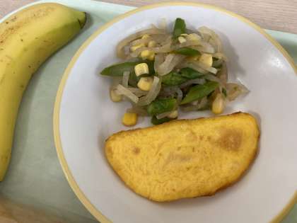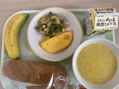 今日の献立は、黒糖コッペパン、オムレツ、アスパラサラダ、かぼちゃポタージュ、バナナ、牛乳です。