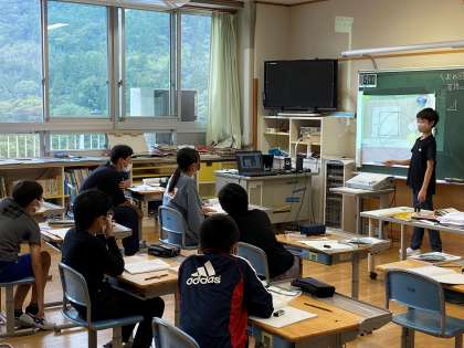 円の面積の求め方を利用して、ラグビーボールのような形の面積を求めようとしています。どこの面積なら計算で求めることができるのか整理して考えています。みんなで考えると難しい問題でも分かってくるようです。