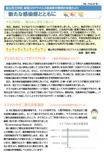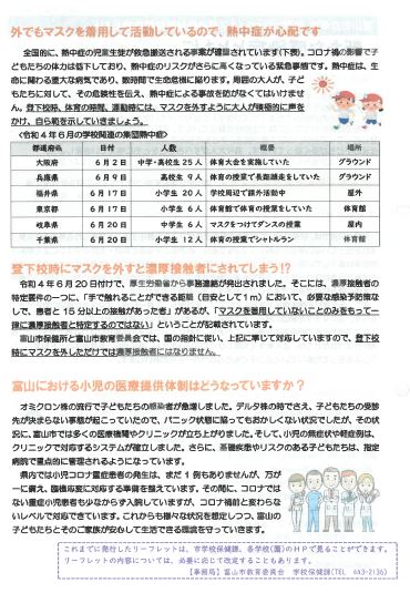 参考として、「富山市立学校 新型コロナウイルス感染症対策検討会議だよりVOL.19」を再掲しました。ここにも、マスク着用についての考え方が記載されていますが、学校では、マスクを外せる場面(登下校時、運動時、室内でも距離が取れる時や周りに人がいない時等)ではマスクを外すようにしています。