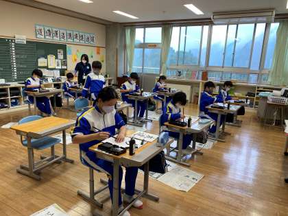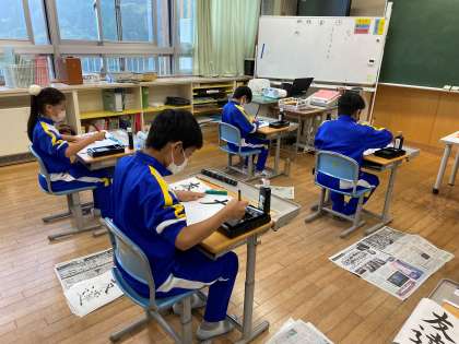今日は、先週習った、しんにょうの形やつくりとの位置関係などに気を付けながら、清書を書いていました。
