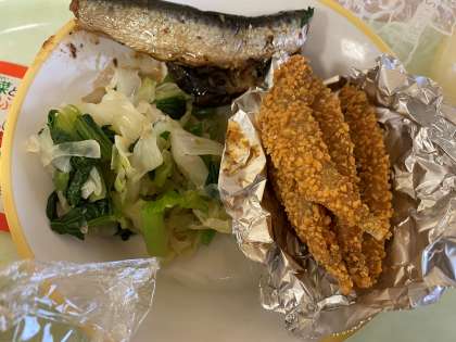 今日はお皿のおかずが、きびなごのさくさく揚げといわしの土佐煮、おひたしの3つあります。いわしの土佐煮は、先日振替休業になった日に予定していたおかずだそうです。おいしいおかずがたくさんあり得した気分です。