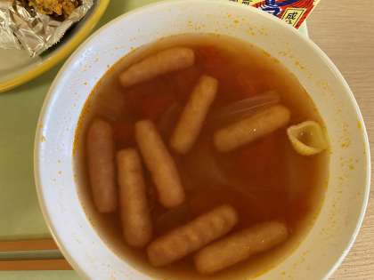 トマトスープはウィンナーやマカロニ等、具だくさんです。