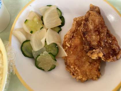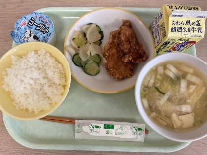 今日の献立は、ごはん、豚肉の竜田揚げ、かぶの色どり、呉汁、ヨーグルト、牛乳です。