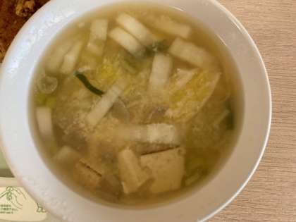 呉汁は、大豆をすりつぶしたもの(呉)を入れたみそ汁です。呉が入っている分、味がやさしくなる感じがします。温かくて野菜も味が浸みています。豚肉の竜田揚げは、かりっとしていました。
