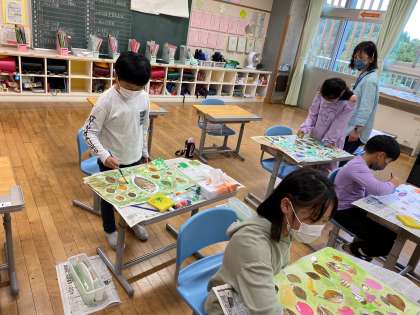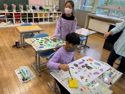 葉を貼っていない部分に水彩絵の具でデザインを描き込みながら、完成を目指しています。カラフルなデザイン、葉っぱに似た色で渋いデザイン、思い思いの作品作りに取り組んでいます。