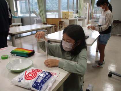 今日のクラブ活動では、どうしたら割れにくいシャボン玉ができるのかインターネットで調べました。すると、洗濯のりや砂糖を石けん水に混ぜるとよいことが分かり、分量を正確に量り取りながらシャボン玉液を作りました。