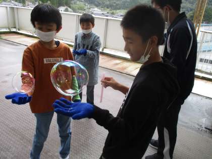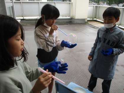 シャボン玉を作ってみると、手で触っても割れにくく、手のひらにのせたり、ポンポン弾ませてみたりして不思議な体験ができ、とても楽しく活動しました。