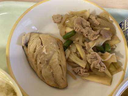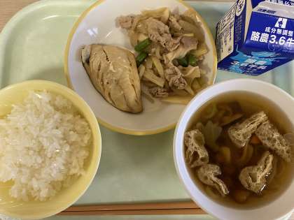 今日の献立は、ごはん、さばの塩焼き、マコモタケの炒め物、きのこ汁、牛乳です。