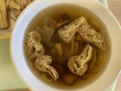 マコモタケは、クセがなく、柔らかいタケノコのような歯ざわりがあります。実際には、イネ科の多年草で竹とは関係がありません。きのこ汁には、しいたけやマイタケ、なめこがたくさん入っています。