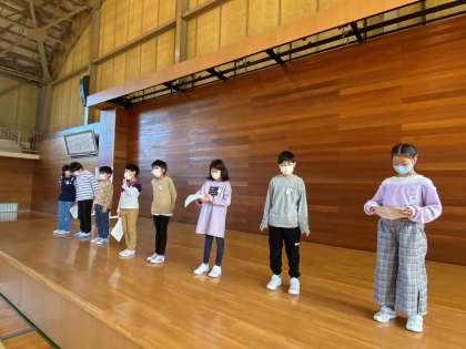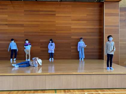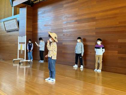 3・4年生は、体育館のステージを使って、発表の練習をしていました。大きな体育館で聞こえる声を出すこと、聞いている人に分かりやすいスピードでしゃべることなど、目的をもって練習しています。