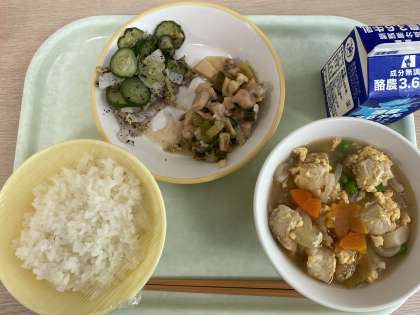 今日の献立は、ごはん、あっさりチキン、ゆかり和え、厚揚げの錦とじ、牛乳です。