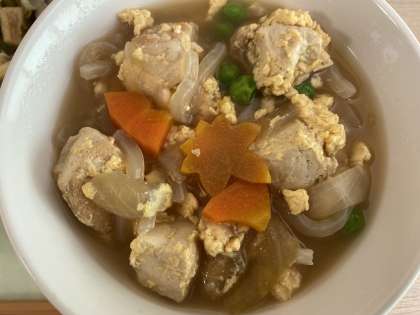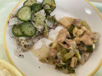 錦とじとは、卵とじのことを言います。たっぷりの具を卵でとじてあります。あっさりチキンは、小さくした鶏肉とねぎやタケノコと一緒に炒めてあります。名前のとおり、あっさりとしていて食べやすいです。今日もおいしくいただきました!