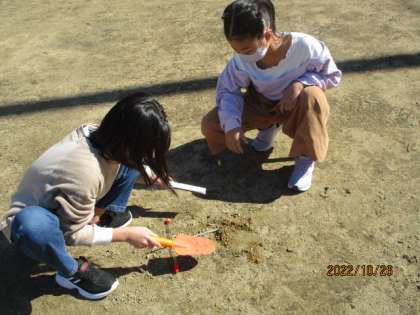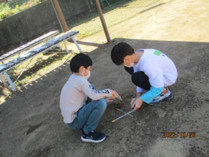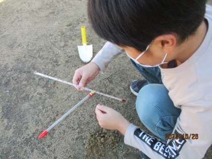 日なたと日かげの地面では、温かさが違うことは手で触って知っていた3年生。今日は温度計で実際に測ってみました。すると、その温度差にびっくり。日なたと日かげの地面の温かさの違いを、目でもしっかりと確かめることができました。