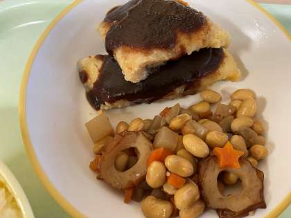 今日の献立は、ごはん、魚の甘みそかけ、五目煮豆、うすくず汁、牛乳です。