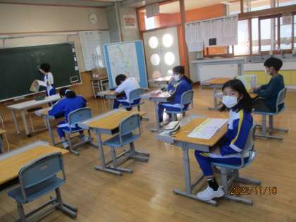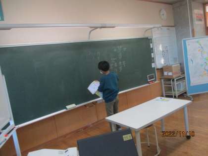 今日の二人の先生たちは、「芽」と「改」の漢字を教えてくれました。それぞれの文字に「はらい」の画がいくつあるのかをクイズに出されると、4年生たちは一生懸命に見て確かめながら答えていました。