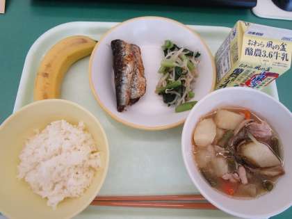 今日の献立は、ごはん、いわしの土佐煮、もやしのおひたし、豚肉の南蛮煮、バナナ、牛乳です。