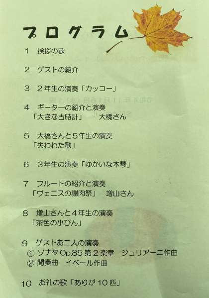 黒田先生のお知り合いのフルート奏者とギター奏者のお二人がゲストとして参加してくださいました。碧っ子も一緒に参加する演奏やお二人の演奏もあり、すばらしいひとときを過ごすことができました。