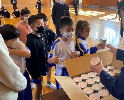 その後、避難時の非常食となるビスケットを中学生から受け取りました。