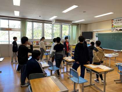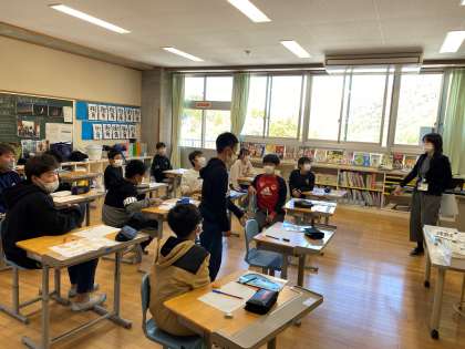 6年生の国語では、教頭先生と「漢字の成り立ち」について学習していました。2人の人が同じ方向を向いている姿から「比」ができているなど、意見を伝え合いながら楽しく学んでいました。