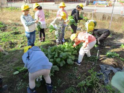 種をまいた小松菜が大きくなり、収穫しました。豊作でとてもうれしい様子の子供達でした。収穫した野菜は、「家で卵焼きに入れたり、おひたしにしておいしく食べる」と話していました。