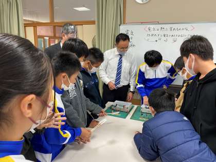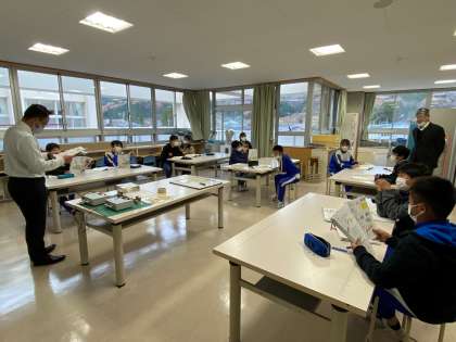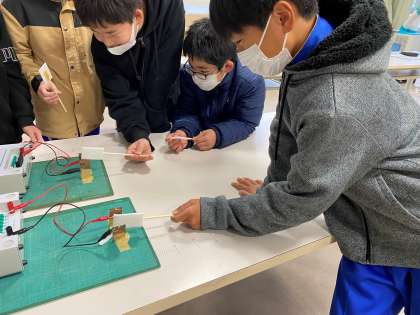 今日は、電池2個を使って電熱線を発熱させて、発泡スチロールを切る実験を行っていました。