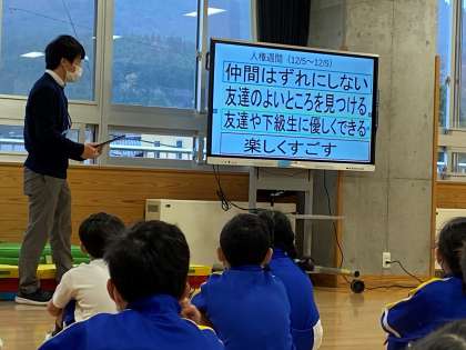 今日の朝の集いは、「人権週間」の取組の一つとして、みんなで人権について考えました。担当の先生から「仲間はずれにしない」「友達のよいところを見つける」「友達や下級生に優しくできる」「楽しく過ごす」について話を聞きました。その後、「わたしのいもうと」という絵本を読みました。いじめや仲間はずれが、心に計り知れない傷をつくってしまうことについて考えさせられる内容でした。
