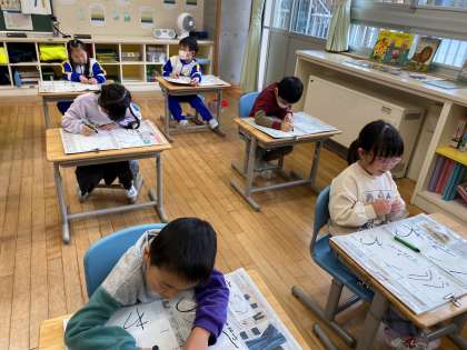 1年生にとっては初めての書き初めですが、落ち着いて練習に取り組みました。講師の先生に「みんなしっかりした字を書くね!」とほめられていました。