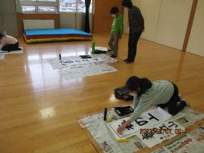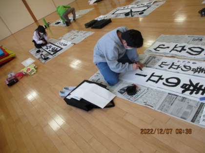 書初めは2度目となる4年生。今回は「春の立山」に挑戦です。3年生と一緒に多目的教室で練習しました。初めてだるま筆を握る3年生のお手本にもなろうと、準備から張り切っていました。