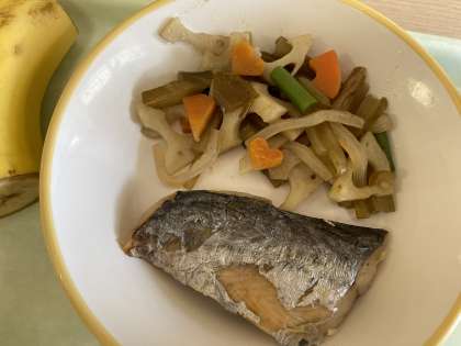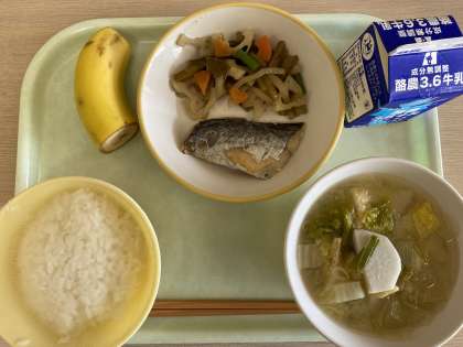 今日の献立は、ごはん、鰆の塩焼き、茎わかめのきんぴら、具だくさん汁、バナナ、牛乳です。