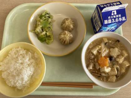今日の献立は、ごはん、ショウロンポウ、チンゲンサイひたし、豆腐ときのこのあんかけ煮、牛乳です。