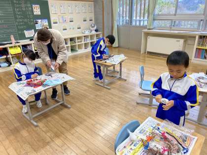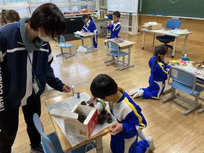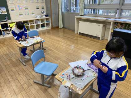 1年生の6人は、自分の家の玄関に飾るリースづくりに取り組んでいました。いろいろな材料を持ち寄って、自分のイメージする飾りづくりに挑戦していました。