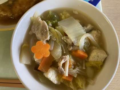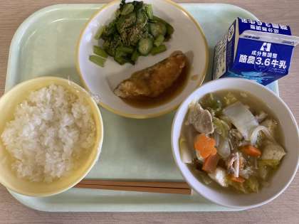 今日の献立は、ごはん、ふくらぎのみぞれかけ、とろろ昆布和え、白菜鍋、牛乳です。