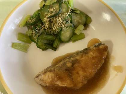 とろろ昆布は富山県が消費量全国一位です。今日は小松菜ときゅうりをとろろ昆布であえたものが出ています。また、ふくらぎに大根おろしの入ったみぞれかけが出ています。