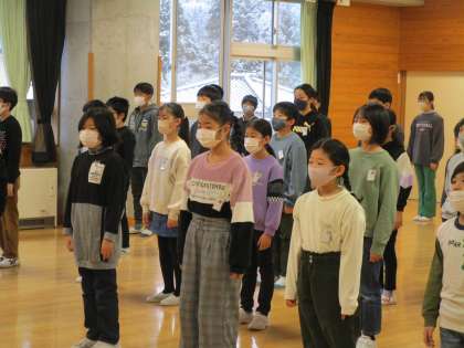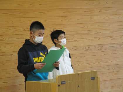 次に、4年生と6年生の代表児童が3学期に頑張りたいことを発表し、最後は、みんなで元気よく校歌を歌いました。