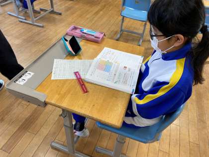 4年生は、広さを比べる活動をしていました。先生の机と子供用の机2つ分では、どちらが広いでしょうか。