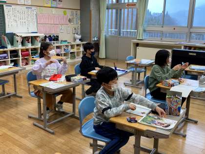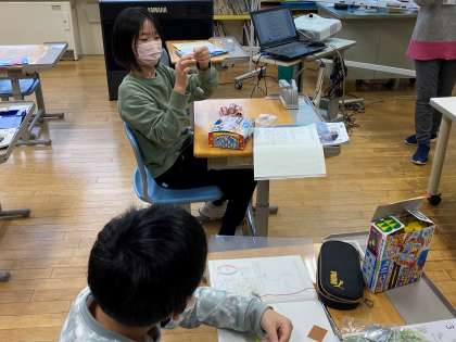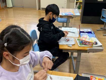 3年生は、電気のはたらきの学習をしています。豆電球に明かりがつくように乾電池と導線でつないでいます。「回路」ができるようにしっかりつないでいます。全員、真剣に取り組んでいました。