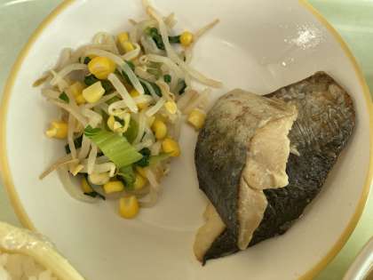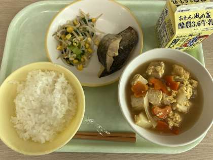 今日の献立は、ごはん、さわらの西京焼き、コーンあえ、厚揚げの錦とじ、牛乳です。