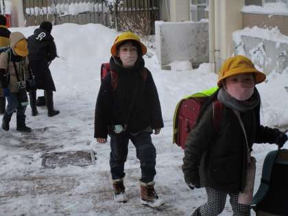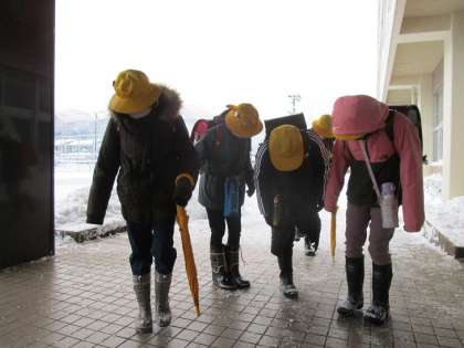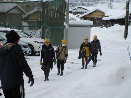 下の写真は、玄関に入る前に、長靴に付いた雪をしっかり落としている様子です。
