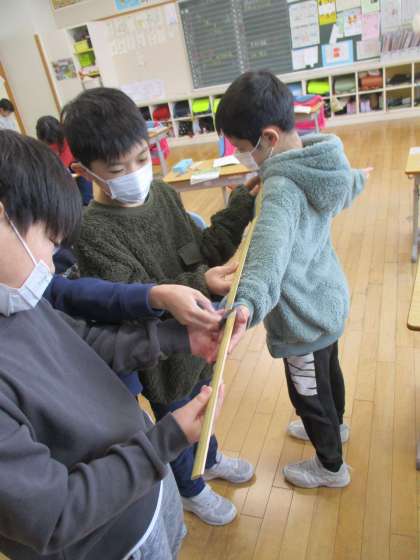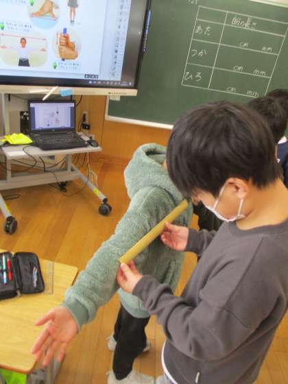 1/26 2年生 学習風景 公開日 2023/01/27 更新日 2023/01/27 2年生の部屋 算数の長いものの長さについて学習しています。自分の「あた」「つか」「ひろ」の長さを友達と協力しながら測定しました。