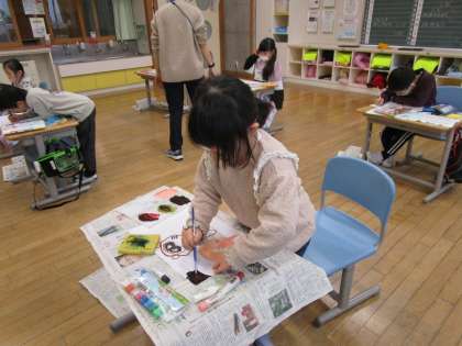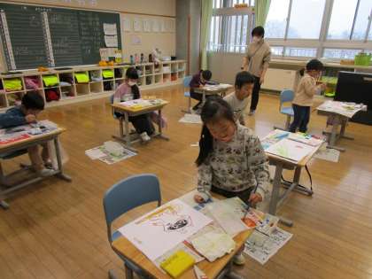 1月30日(月)1年生 図工 公開日 2023/01/30 更新日 2023/01/30 1年生の部屋 国語の教科書にある「たぬきの糸車」の絵を描いていました。 たぬきの顔が、何となく作者に似ているのがかわいらしいです。