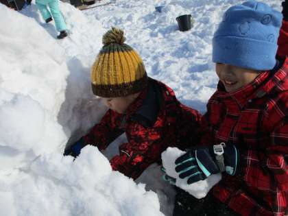 今日は、雪遊びをしました。「かまくら」「すべり台」などを作ったり、グラウンドを散歩したりしていました。楽しく活動していました。スキーウェアなどの準備、ありがとうございました。