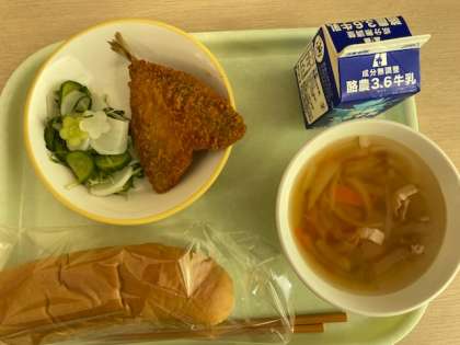 今日の献立は、黒糖コッペパン、アジフライ、かぶのサラダ、マカロニスープ、牛乳です。マカロニスープに入っているマカロニは、ABCのアルファベッドマカロニでした。ついついどの文字が確かめたくなります。