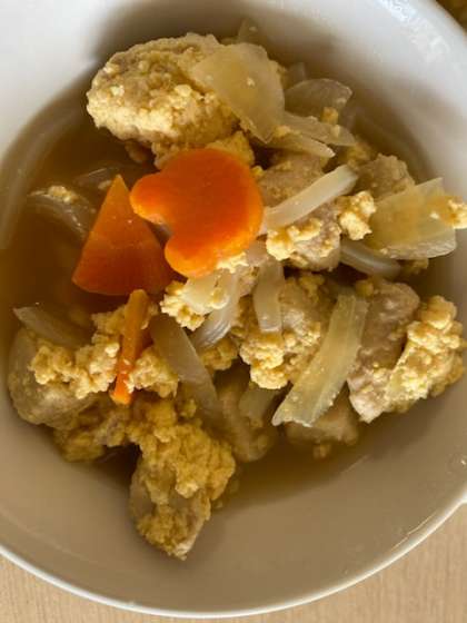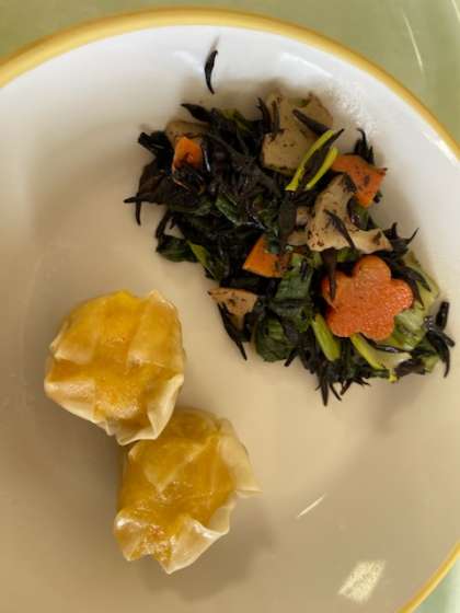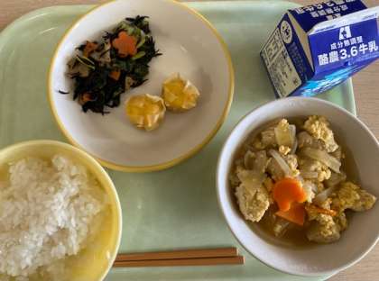 今日の献立は、ごはん、にんじんシューマイ、ひじきと小松菜の炒め煮、高野豆腐の卵とじ、牛乳です。