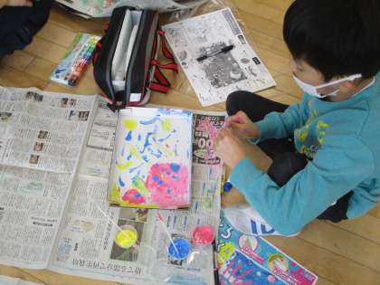 図工では、液体粘土に絵の具を混ぜて色をつくり、絵を描きました。手の平や指を使って自分の作品を仕上げていました。